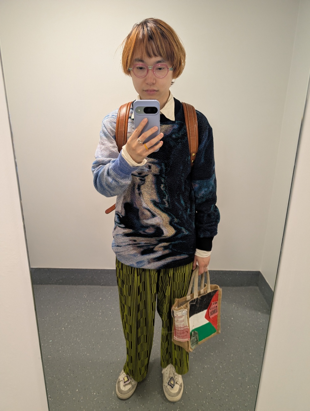 長谷川白紙とハトラのboys textureのニット、とても褒められがち。このカバン、最近はもう一つのほうがメインなのであんまり使ってないが使うと褒められがち。ファッションよく褒められますが、褒められるのは気分がいいですね…。