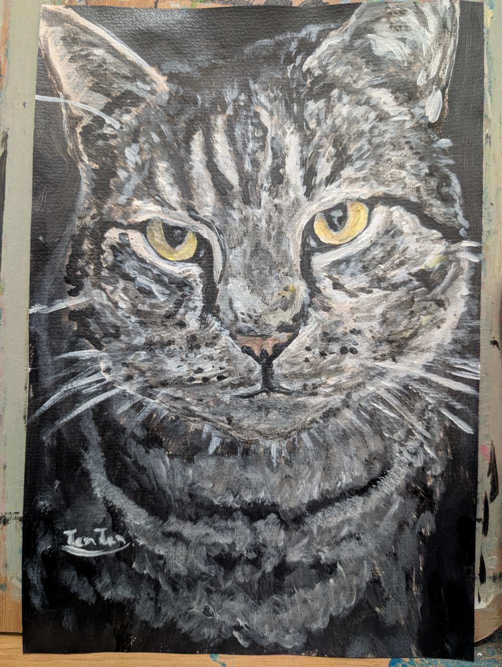 ヒゲが荒いのは細い筆がないので仕方ないのだが、あえて止めました、ではない未完成感が気になる。こっから3時間くらいあーでもないこーでもないと触り続ければぐっと良くなる予感もありつつ、その場合何かわからないけど良くなったという結果になるので、こうすればいいのに!というコツをつかみたい。毎日絵を描くのはかなり楽しい。
