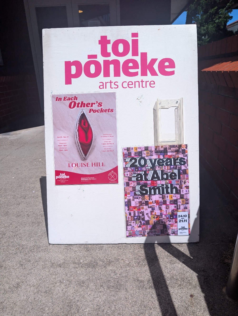 その後街で白い絵の具と画用紙と筆を購入し、Toi Pōnekeというギャラリーへ。今月半ばまでクィアアーティストの合同展をやってたらしいのだが、行きそびれてしまって、今は展示替えしておりポケットにフォーカスした展示と、ギャラリー20周年でこれまでの展示ポスター総集編みたいなことをしていた。ポケットは自由、プライバシー、備えを持つという機能があり、ポケットのデザインにジェンダー差がある(レディース服にポケットが無いという話)、ポケットを奪われている=自由、プライバシー、備えを剥奪されている、というポケットの政治性の話を他人のポケットを覗いたり覗けなかったりしながら考えられるよ、という展示だった。良かった。