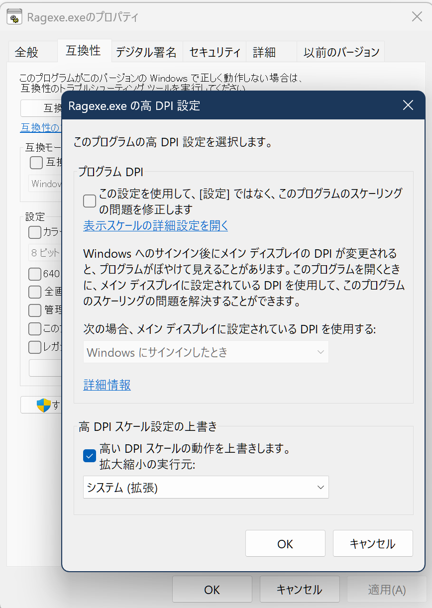 で、Windowsには互換性の設定というのがあるので、これで高DPI設定をシステム(拡張)あたりにしてやれば上記の拡大設定に合わせて拡大してくれます。