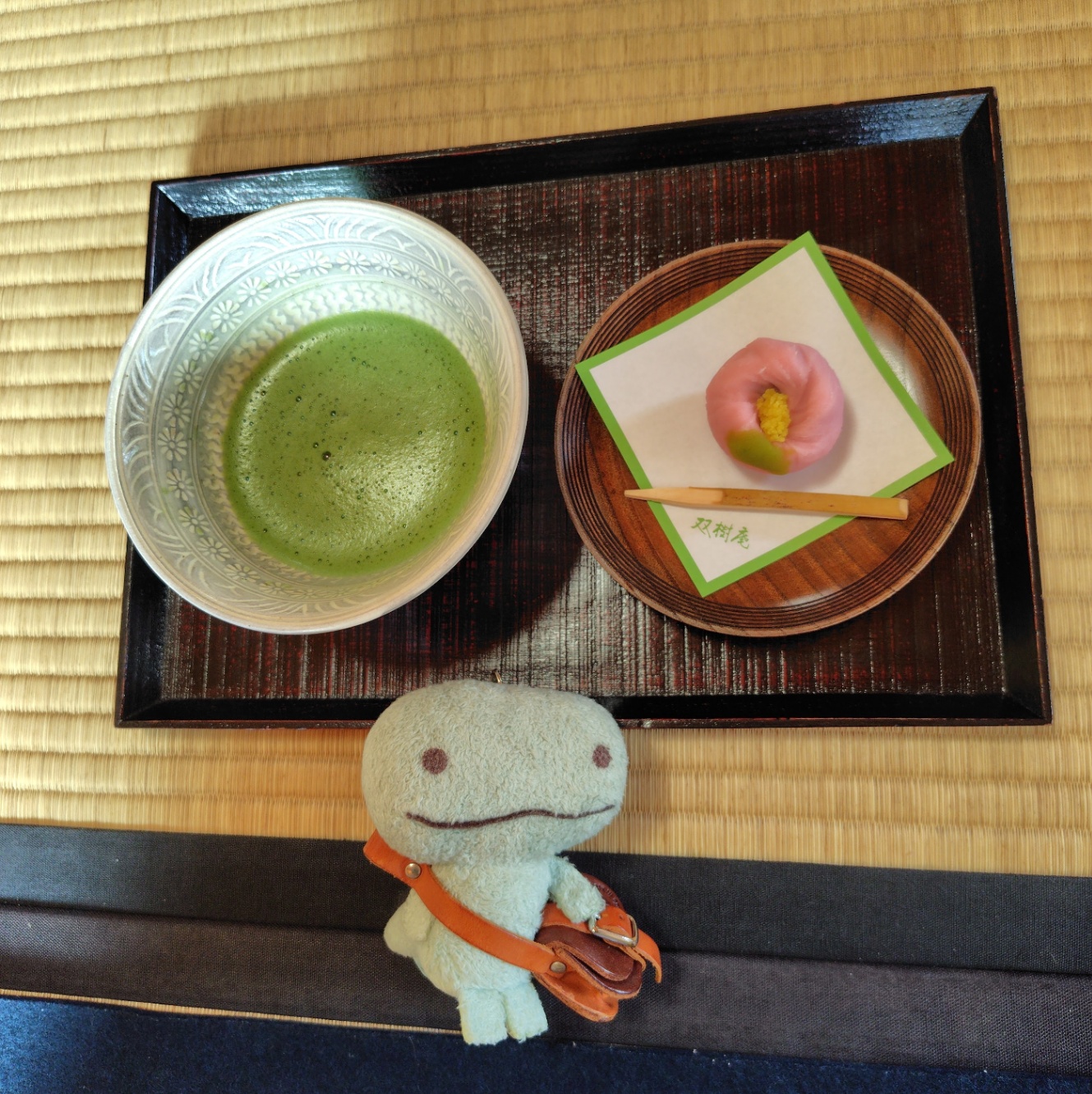 双樹庵でお抹茶と和菓子を頂いた。和室! も、随分久しぶりかも。とかげちゃん、マナー違反な気もしたけど、一瞬だけ。しっぽがあるから少しななめ。