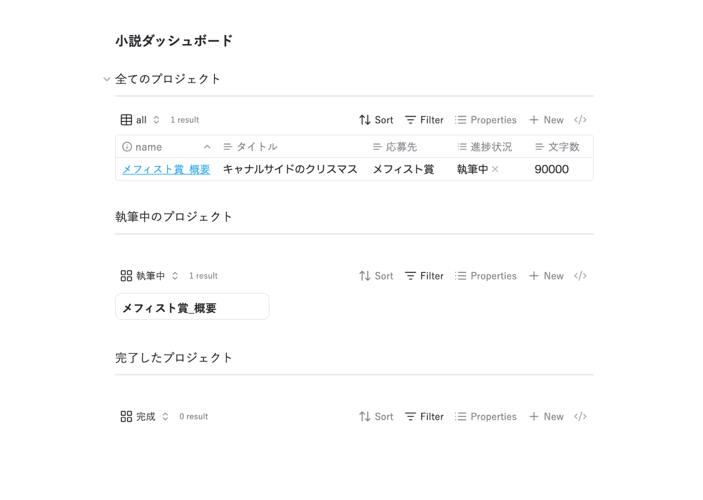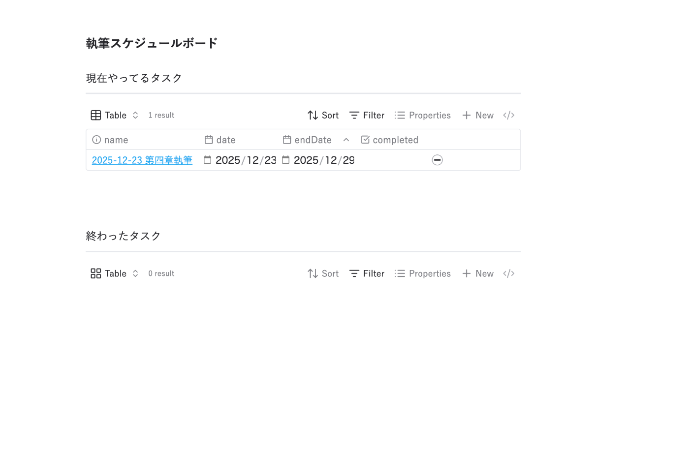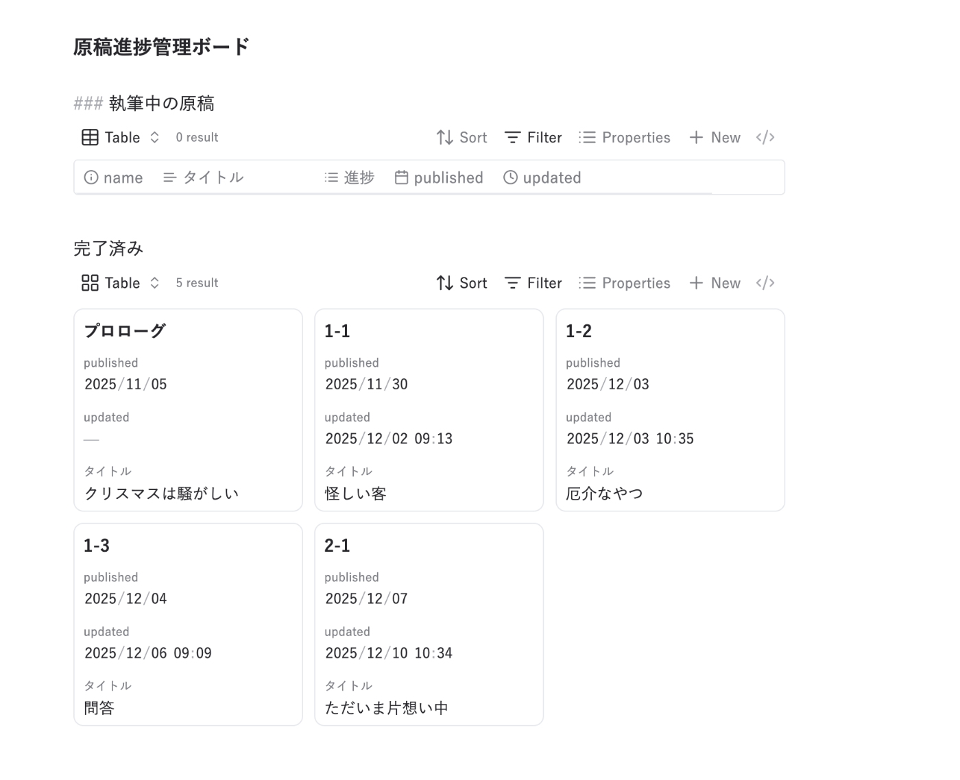こちらでは原稿管理をしている。「進捗」プロパティを完了に変えると、下の完了済みに表示される。