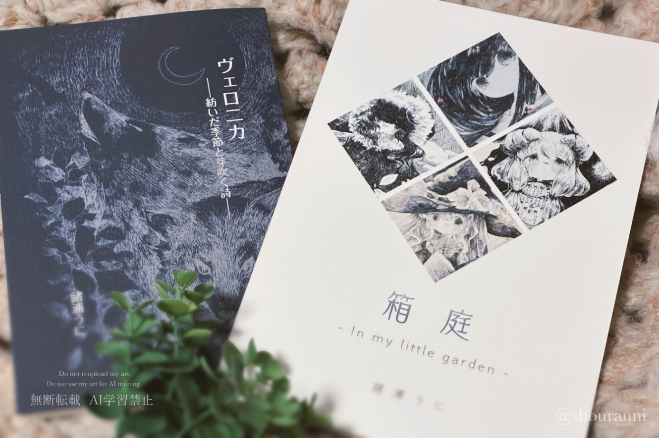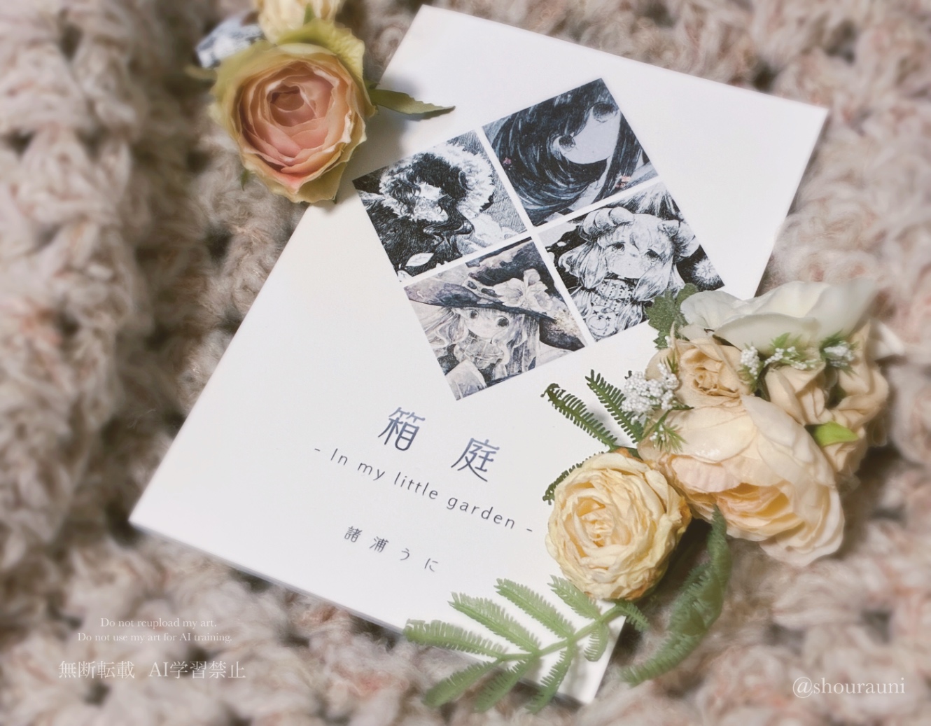これまで作ったビブリオマンシーにもなる絵本『いつかのきみへ、花束を』と『マグノリア』、短編小説『ヴェロニカ』の挿絵。そしてSNSに投稿してきたイラストの再録本になります。他にも未発表のイラスト5枚、没にした挿絵1枚も収録しています。