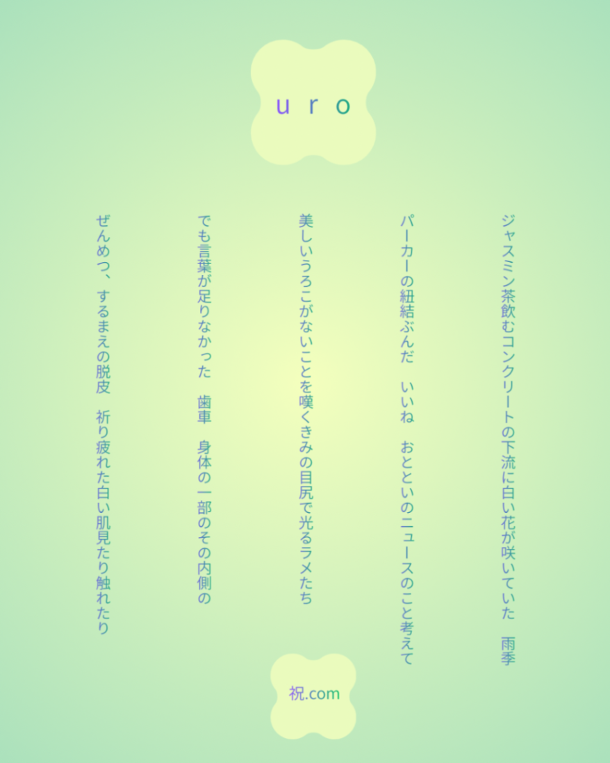 《 uro 》ジャスミン茶飲むコンクリートの下流に白い花が咲いていた 雨季パーカーの紐結ぶんだ いいね おとといのニュースのこと考えて美しいうろこがないことを嘆くきみの目尻で光るラメたちでも言葉が足りなかった 歯車 身体の一部のその内側のぜんめつ、するまえの脱皮 祈り疲れた白い肌見たり触れたりtanka短歌祝.com発表した短歌をまとめてます○