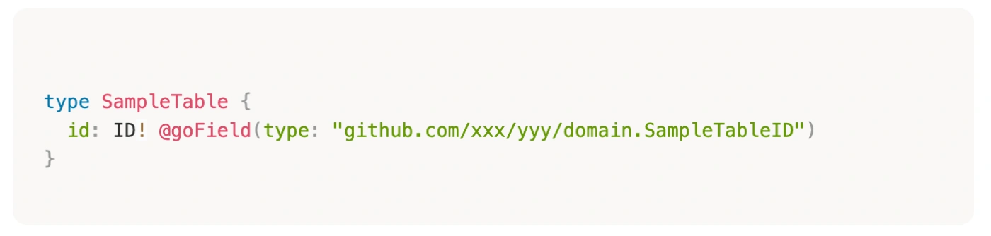 GraphQLはID型を利用するが、domainではテーブルごとにIDを用意している。この場合は、コード上でID型とdomainのテーブル固有のID型の間で変換が必要になるが、goFieldのtypeフィールドを利用することで不要になる。