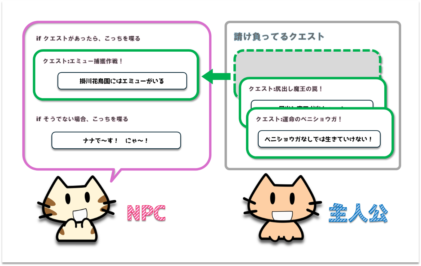 見て分かる通り、NPCには通常時のセリフしか設定されていない。クエストの際のセリフは主人公が「クエストの台本」のようなものを持っていて、それを提示してNPCに読ませている。複数のクエストが走っていた場合、FFXIでは話しかけるごとに順番に違う台本を読んでもらい、World of Warcraft では会話の前にUIでどのクエストの情報を喋るかを選択する。ストーリーがすべてクエストに分解されて実装されることになり、これによって物語が受ける制約もあるが、いまのところ大規模なゲームのテキストを捌くには有益な方法であると思われる。
