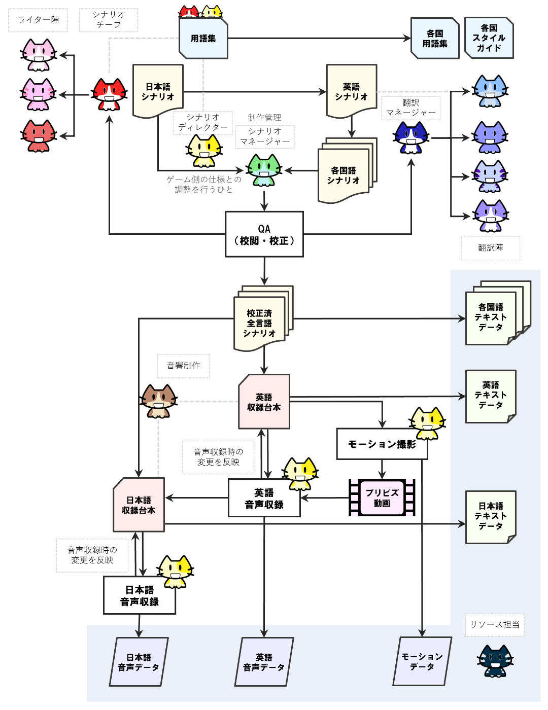 さて、仕様が決まったらテキストをデータ化していくわけだが、そこで重要になるのが制作フローで、ここに気を配っていないと簡単にプロジェクトが止まる。いまのゲームはUnityやUnrealEngineなどのゲームエンジンを使って、レベデザイナーというステージをデザインするひとが直接テキストでもなんでも仕込んでいけるのだが、そこを管理するひとがいないと、いつの間にかそこは魔窟になり、そこで巻き戻しが発生するとまた制作費にして数千万が簡単に飛んでいってしまい、それも概ね「こんなトラップがあるとは気が付かなかった」のように納得されてしまうのだが、実際には防げる問題だ。その数千万は、ワークフローが考えられていれば失われることはなかったし、他の箇所のクオリティアップに使えた資金だ。