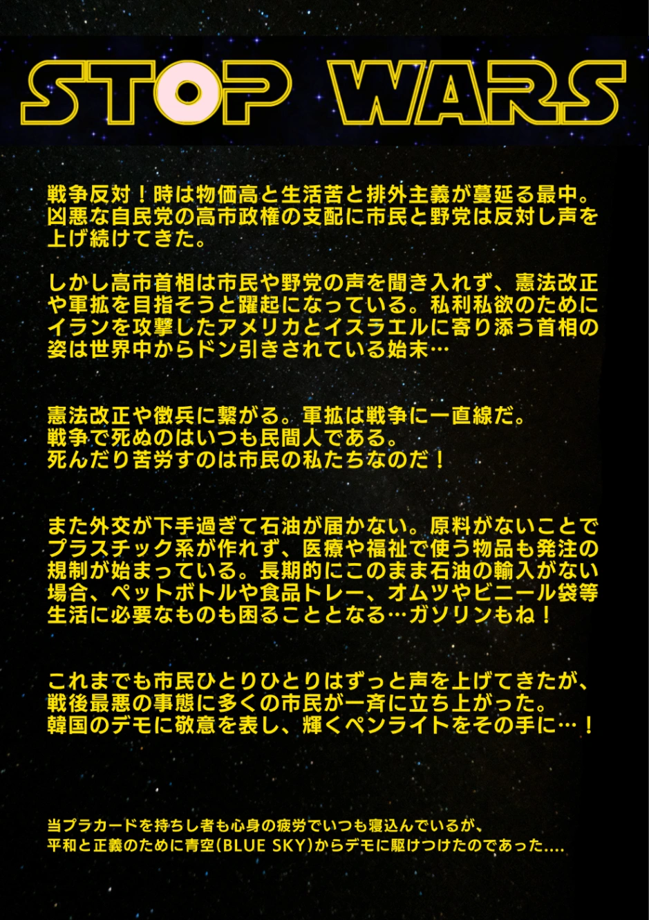 ↓スターウォーズのOPのオマージュ。ずっと反戦の物語やってるスターウォーズのオタクなのでこれくらいやらせろや…と投稿したらちょっとバズってしまい、チキンなので消しちゃったやつ。もっと元ネタに寄せた文でも作ったし遠くに飛ぶようにやってもいいけど、なにぶん視認性が悪いのとネタが通じないだろ…と思って掲げられてない😂(冒頭の戦争反対!はエピソード3の戦争だ!のオマージュ)