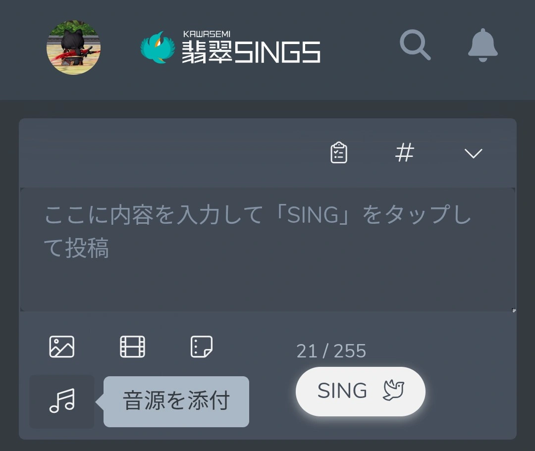「翡翠SINGS」さんでは投稿に画像、テキスト、動画、音源を添付することができます。