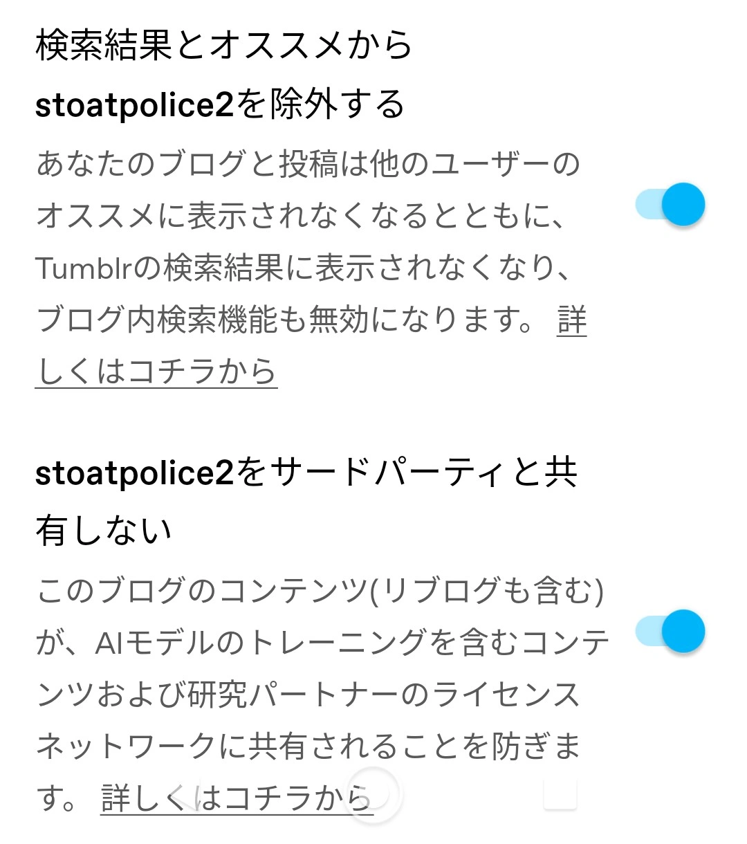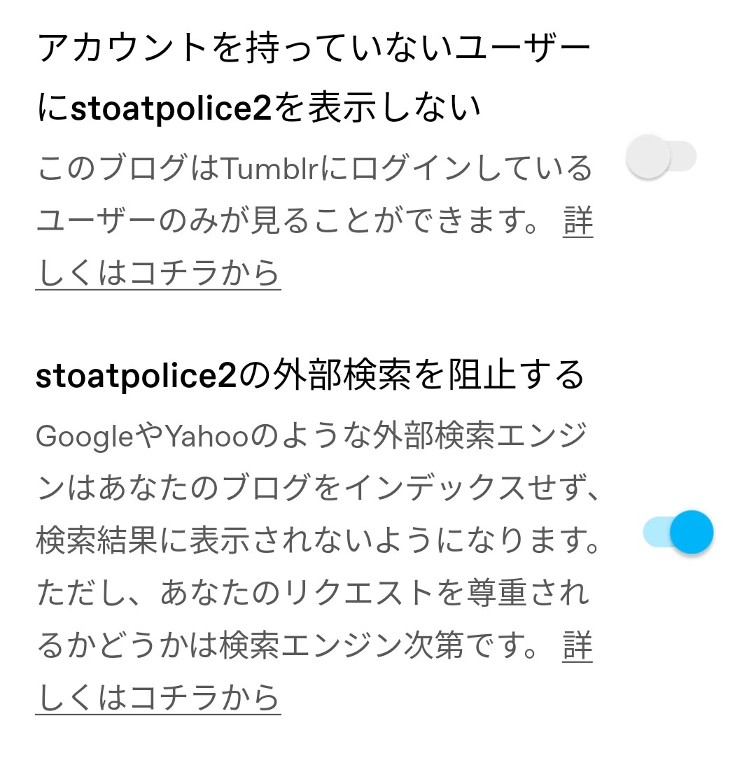 「tumblr」さんはTwitter型SNSのような機能も持ちますが、自分のブログをtumblr内外の検索から除外することができます。