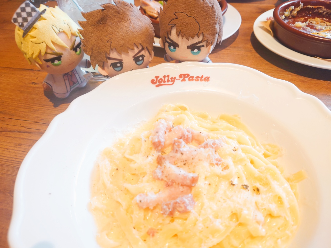中途覚醒~~。後輩ちゃんとお互いの自宅からの中間地点くらいにあるジョリーパスタでおひるを食べる会(またの名をジョセフさんの夢絵を描いてくださって誠にありがとうございましたの会)。ジョリーパスタに行くたび結局フェットチーネのカルボナーラに心惹かれてしまう。いつもは頼まないアヒージョとマッシュポテトも食べ、おいしかった~~しぜ~んぜん追い出されないので気づいたら5時間くらい粘ってしまっていて、さすがに気まずくて退店した。ごちそうさまでした。転職活動~~業種~~という話からクリエイター職につくためのポートフォリオに載せられる実績、ないなら作ればいいんじゃあない!?ゲームを!という話になり、わたしがティラノビルダーを学びシナリオを書けば後輩ちゃんが絵を描いてくれるということになり、えっ…………そんな……えっ…………?がぜん ちょっと真剣に考えちゃうんですけど その~……。先日おつかいしてもらったナガノさんのアザラシくじを受け渡していただき、A賞の超特大アザラシがギチギチにガムテで縛られ圧縮されていることに大ウケした。自宅にいるアザラシと体長は変わらないが顔がデッカい、ナガノアザラシ……。