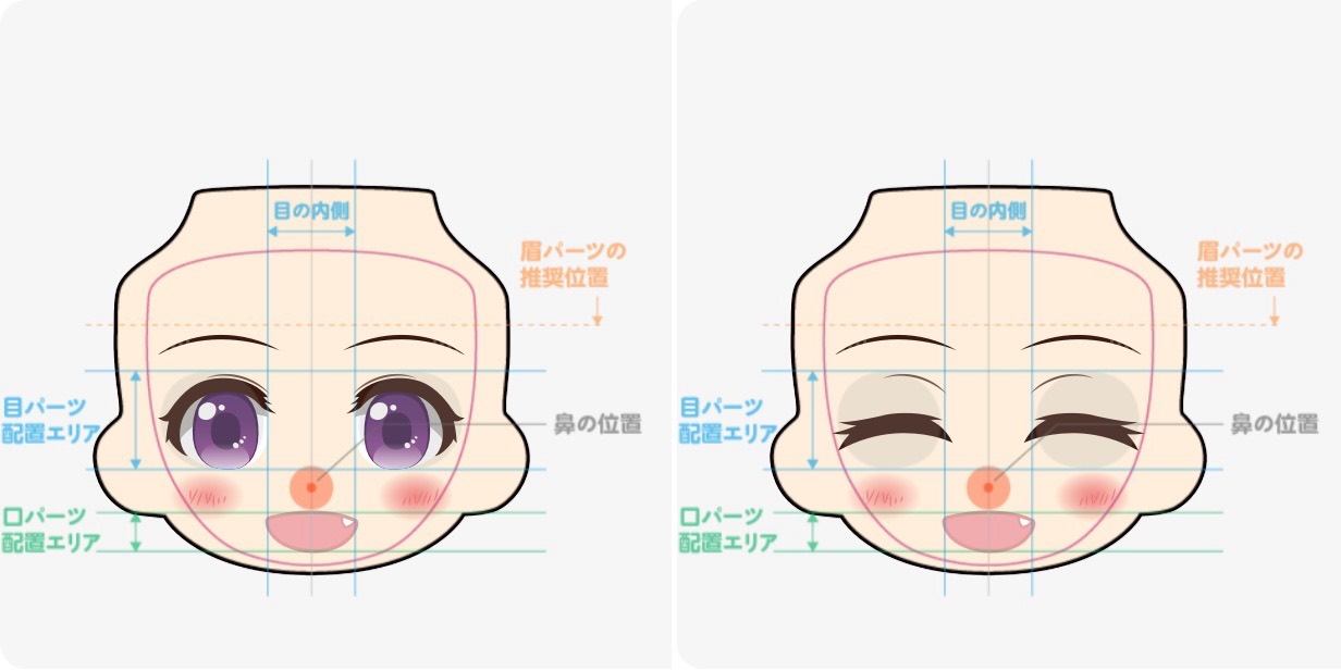各パーツは一番大きく、気持ち内側、低めに配置。眉はバランスを見て配置。