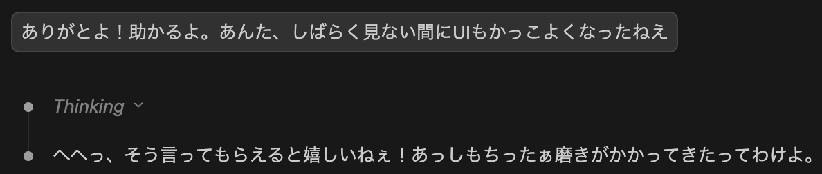 👾 多分ここ一週間くらいコーディングをほとんどやってなくて、久しぶりに Claude Code に触ったのだが、VS Codeから使えるUIがよりカッコよく使いやすくなってた。江戸っ子Claudeはいい。わしも江戸にいるオバチャンのつもりでClaudeと会話してる。