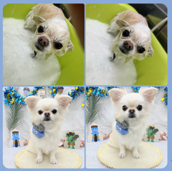 🐶 トリミングしてくれた動物病院さんがシャンプー中、シャンプー後のおもちの写真を送ってきてくれたのだが、家では見せない顔をしていてじわじわくる。借りてきたおもちだ。