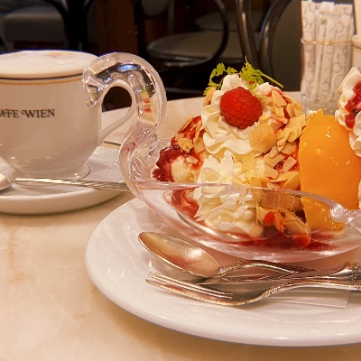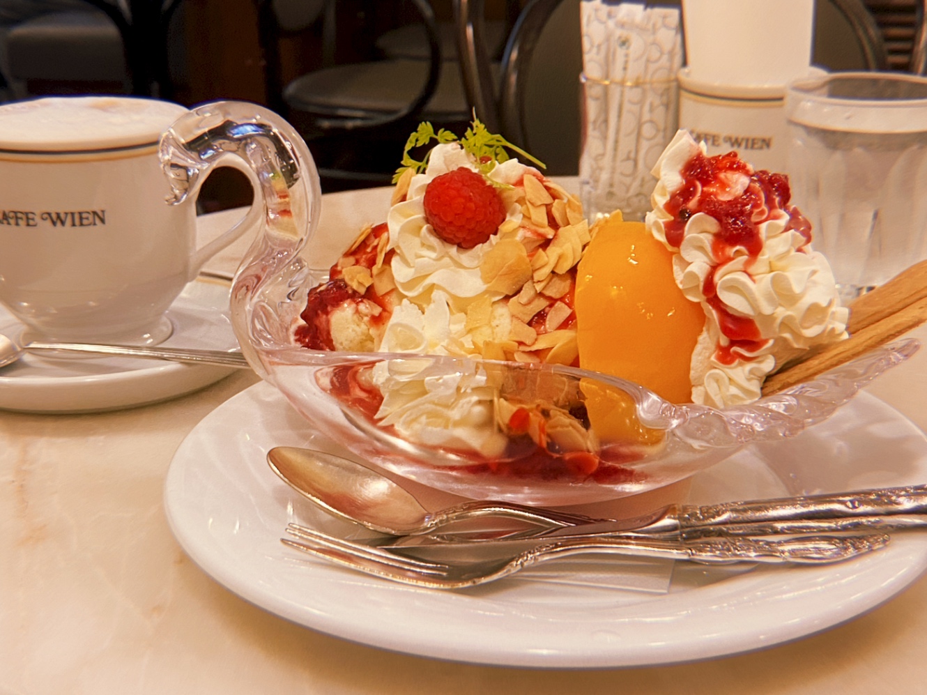 日本橋三越にあるカフェウィーンのフィルシメルバ🦢🍑クリームが意外と甘さ控えめで、アイスの甘さとベリーソースの酸味が絶妙に噛み合って美味しかった。