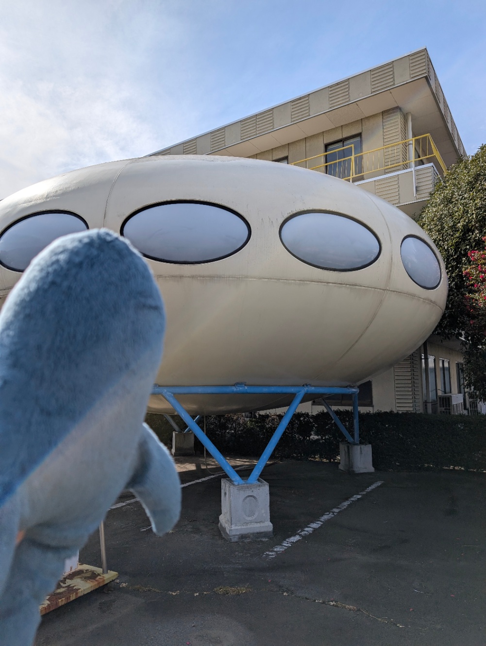 その後、ゆっきゅんがラジオで話していたUFO型のFUTUROと言う建築を見に行った。大きな道路から少し住宅街に入ると急に現れるUFOが異様な雰囲気で面白い。家から連れてきたコサメさんにもUFOを見せたり写真を撮ったりした。