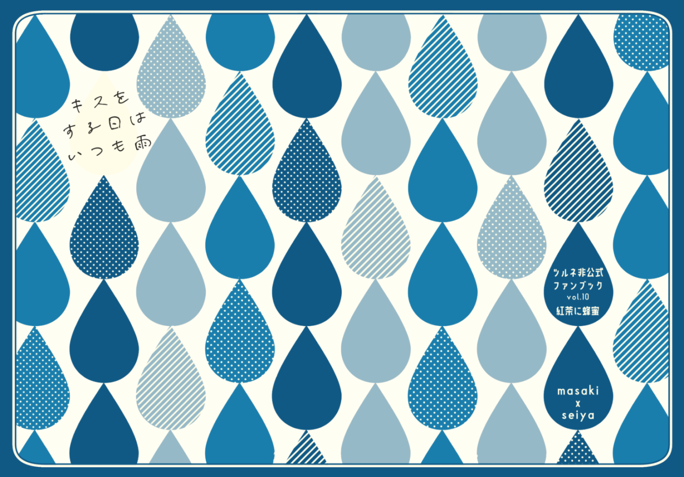 ま、まだ表紙をSAIで作ってやがる…!!だいぶわかりにくいけど本文インクが紺色です。当時は「レインボーPPセット」というセット名だったけど今は「表紙フルカラー×本文単色ダークカラーPPセット」のものですね。「雨」がイメージのカプなのでめっちゃ雨!暗い!ロゴもがんばって作ってる!このあとも「雨」っぽいデザインの本は同じカプです。