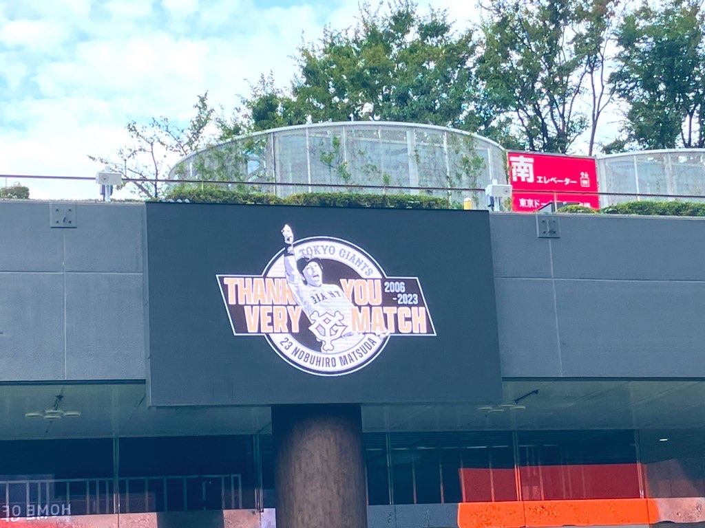 報道であらかじめ知ってたけど、ドーム周辺のビジョンには松田選手の「THANK YOU VERY MATCH」のロゴがあしらわれた投影がたくさんされており…去年の退団時もそうだったけどなんてロゴにしやすいニックネームなんだ…と思う。(マッチ)