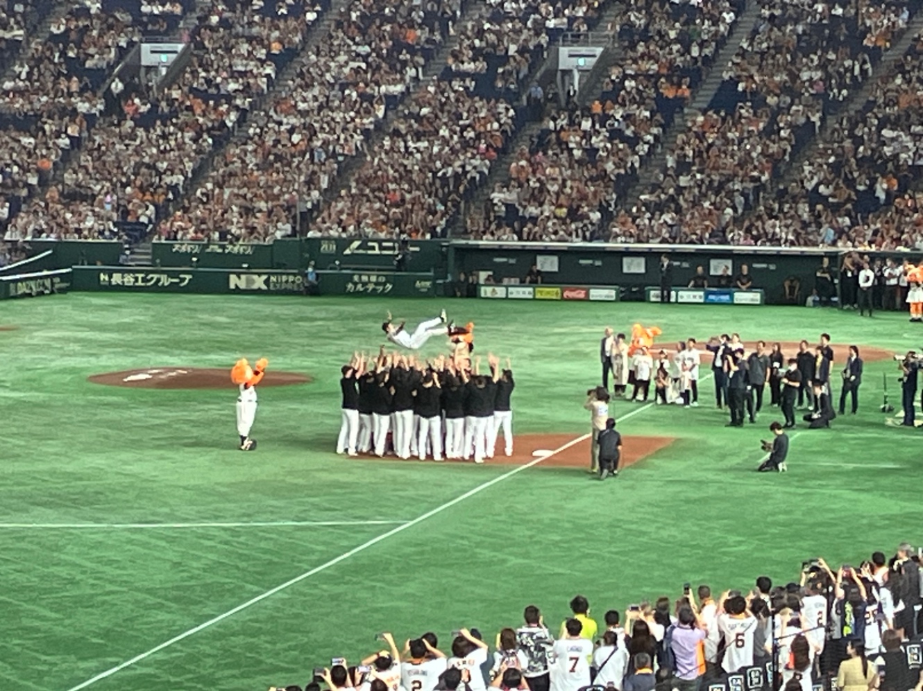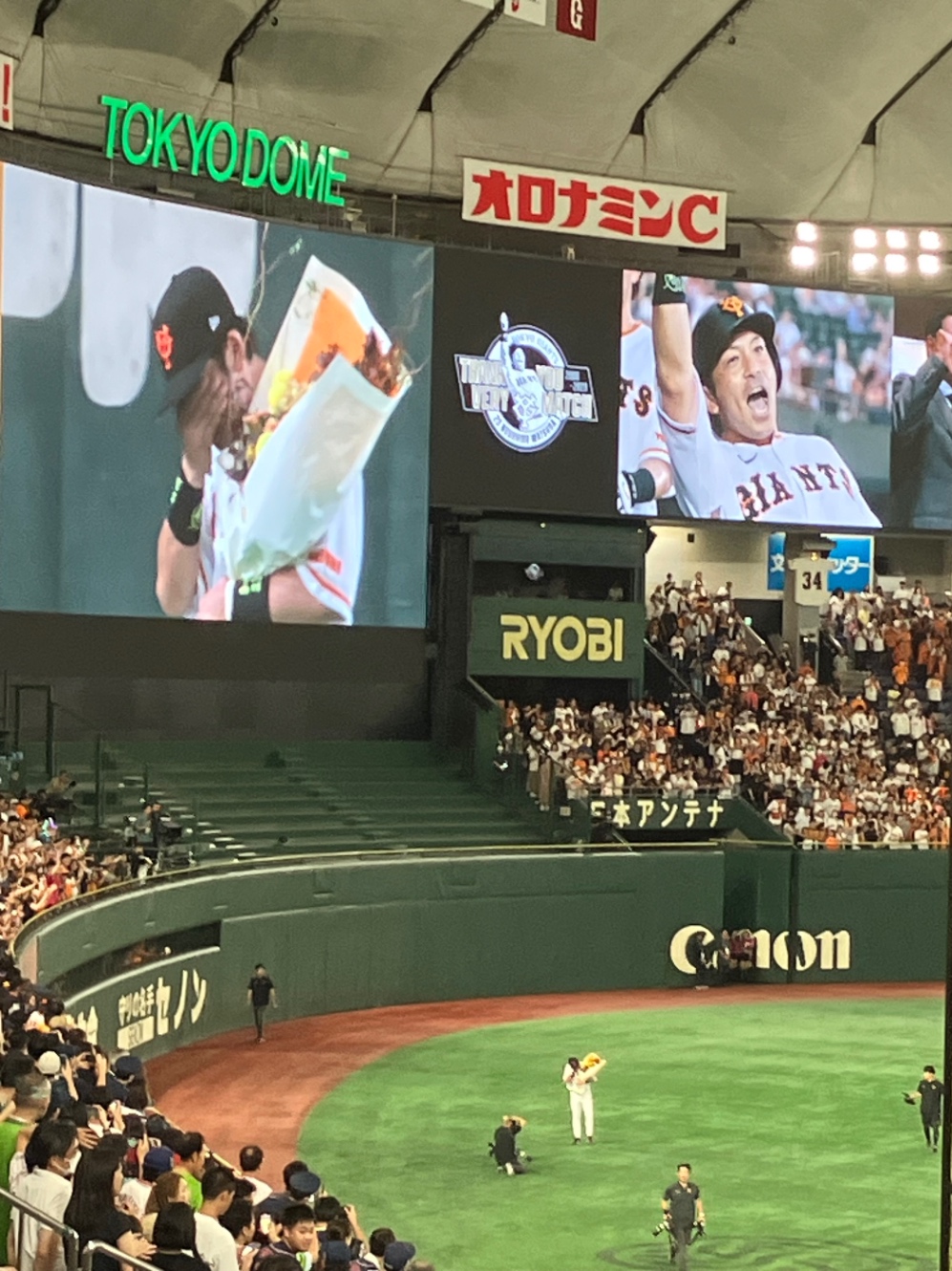 そのあともまたうぅ〜〜〜と顔を伏せて泣いてしまったんだけど、胴上げするみたいだったからまた撮影して、カメラの位置を確認するため急にビジョンに映された赤ちゃんみたいな松田選手に笑い、胴上げされる姿に泣き、また改めて巨人の選手たちと熱男をする姿に笑って泣いた。
