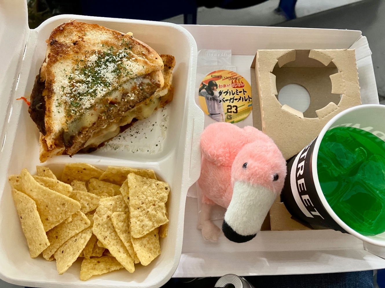 試合が開始してから自席に戻り、とりあえず松田選手の打席がまわるまでに食べる!デカい!粉チーズがぼろぼろこぼれる!!素手で持って食べるしかなく、まごまごしながら食べたけど、肉(パティ)が2枚にミートソースとチーズも挟まってめちゃくちゃ食べ応えがあっておいしかった。球場メシ!って感じ。ドリトスもついてきたし。