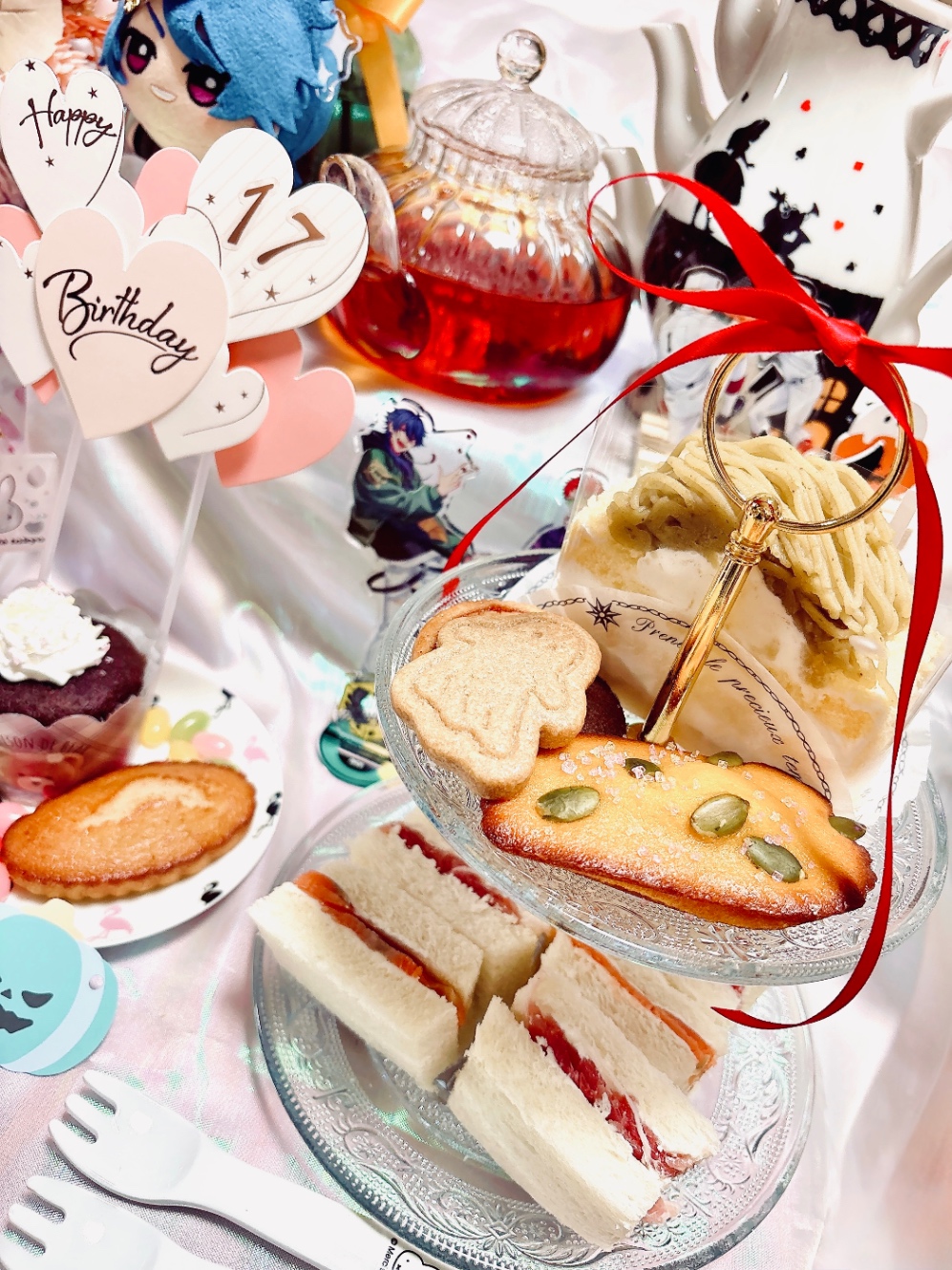 机の上の焼き菓子、カラフルなぽち菓子の準備を終えてからサンドイッチを作り、茶葉の紅茶を準備する。同時に2種類の紅茶を淹れるのが初めてで、電気ケトルではお湯が足りないという事実に気づく。(なんとかする)切り分けたサンドイッチを2段プレートの下段に置き、冷蔵庫からケーキを出して、温めたポットにお茶を淹れて…テーブルに運んでカップに注ぎ……できた!となった瞬間の達成感たるや!!!このあたりの段取りが本当に意味わからんかったけど!!