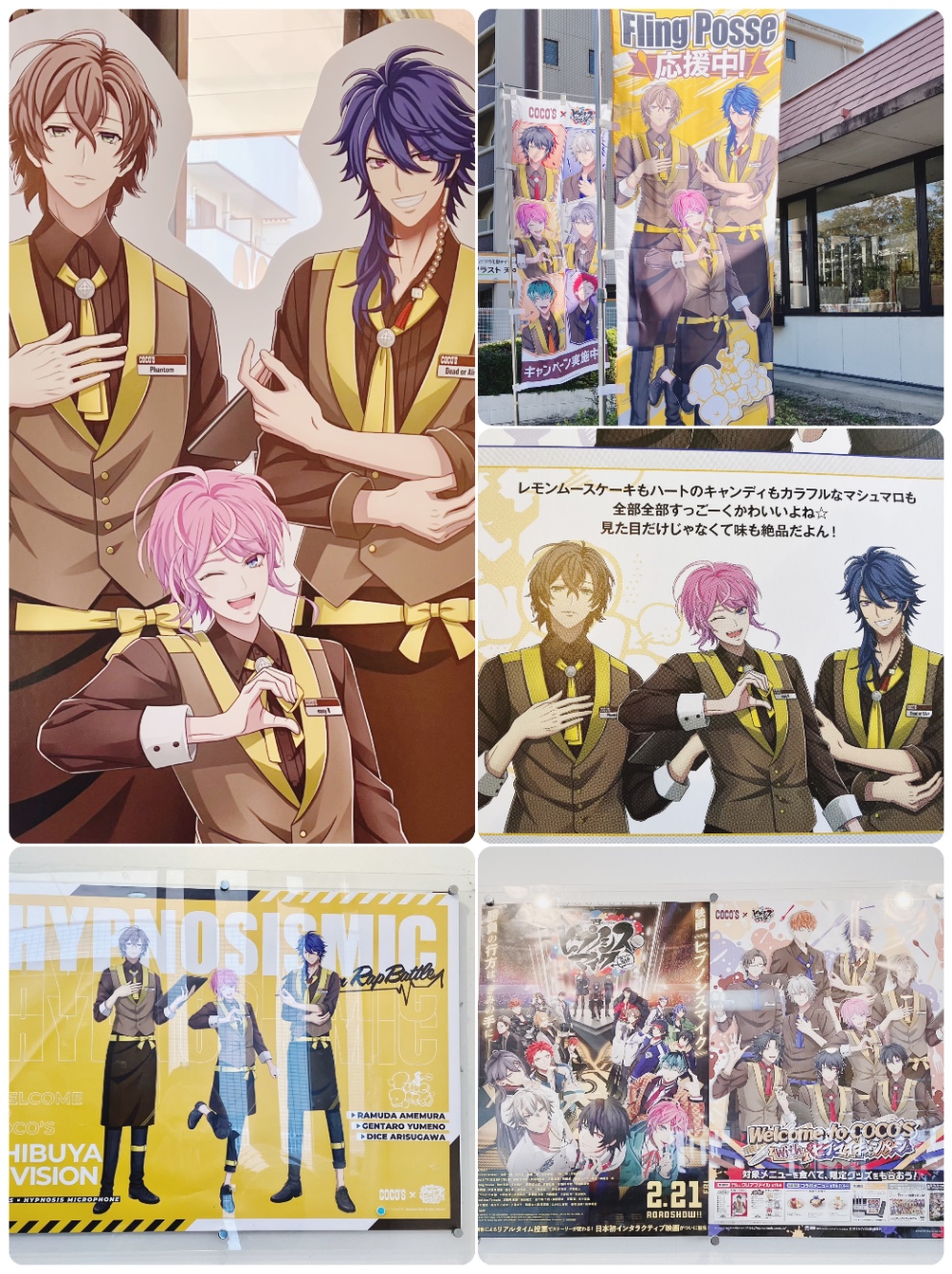 ココス京都梅津店、のぼりが出ていたりぽっせ3人のパネルがあったりポスターが貼られていたり、とてもよかった😊オッ久々にヒプマイのオタクしてんな〜!という実感。メニューにもキャラたちのコメントが書かれており、楽しい。