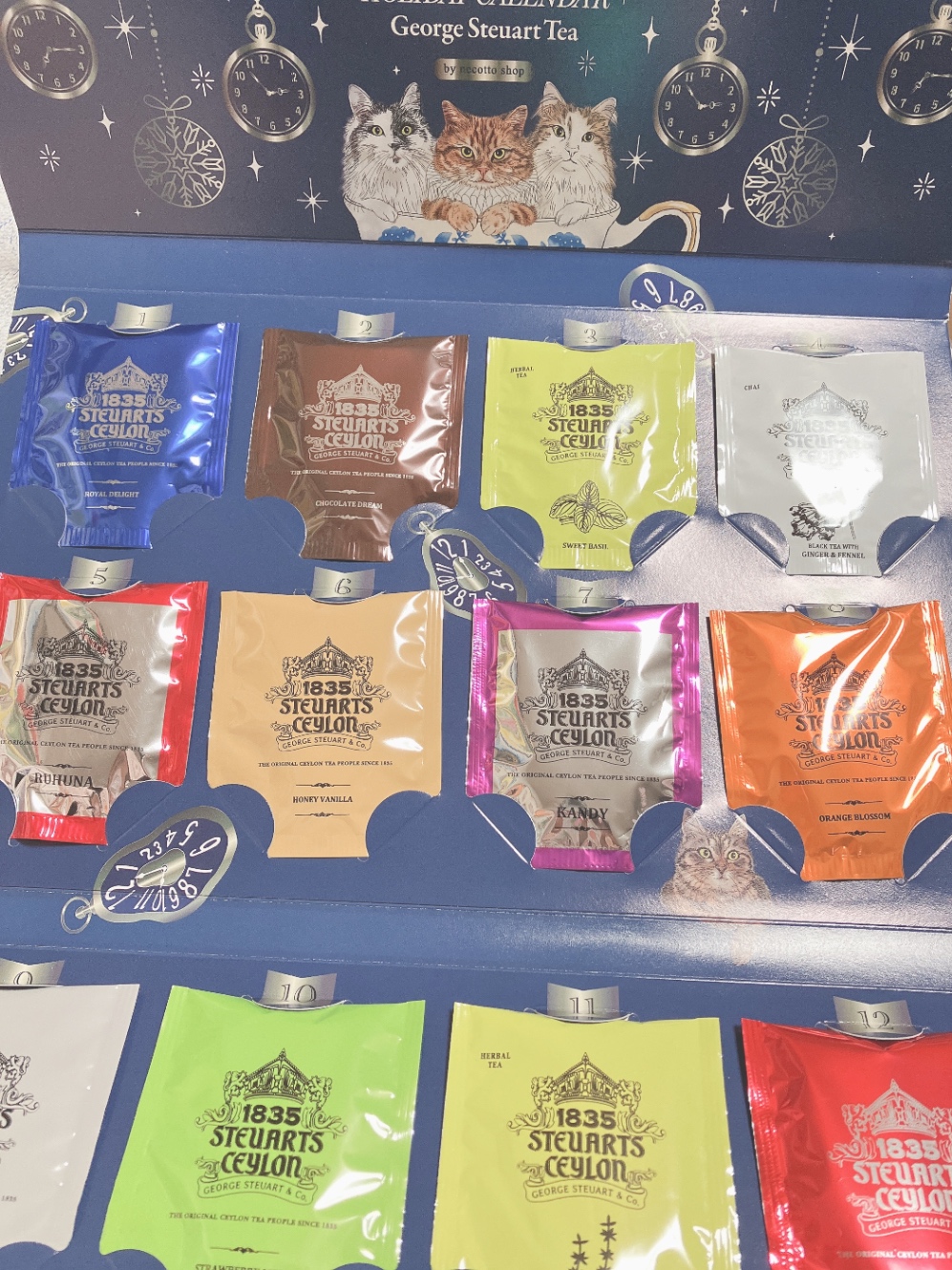 ジョージスチュワートティーの猫のやつ。普通のやつもあったけど、「にゃんともふしぎの国のアリス」がコンセプトだったので。アリスモチーフ大好き。5日から毎朝飲み始めたので今日で4日目。クリスマスは余裕で超えちゃうけど、毎朝の楽しみがあるのはいいこと。昨日のやつはバジルのハーブティーだったんだけど、香りがあまりにもバジルそのものだった。飲みながらずっとマルゲリータピザしか思い浮かばず、飲み物なのに…???って脳が混乱した。