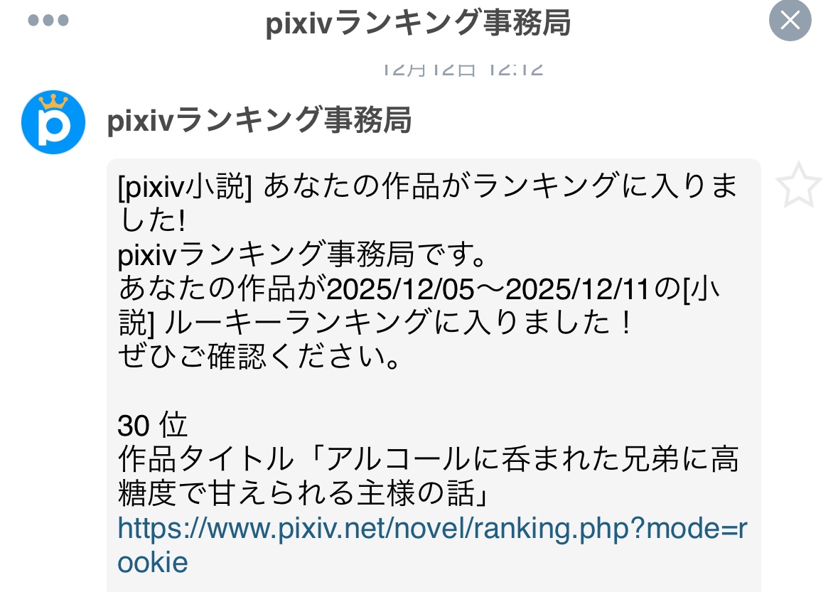 ありがたいことにノラさんのサイトにてこの日、恋愛部門で一位獲得できました〜!!応援してくれた方、読んでくれた方ありがとうございます!!