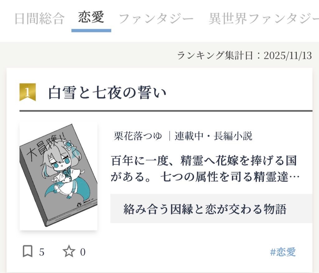 ブックマークと感想スタンプが運良く重なったのとかで、デイリーランキングに入ることができて嬉しかったです!!