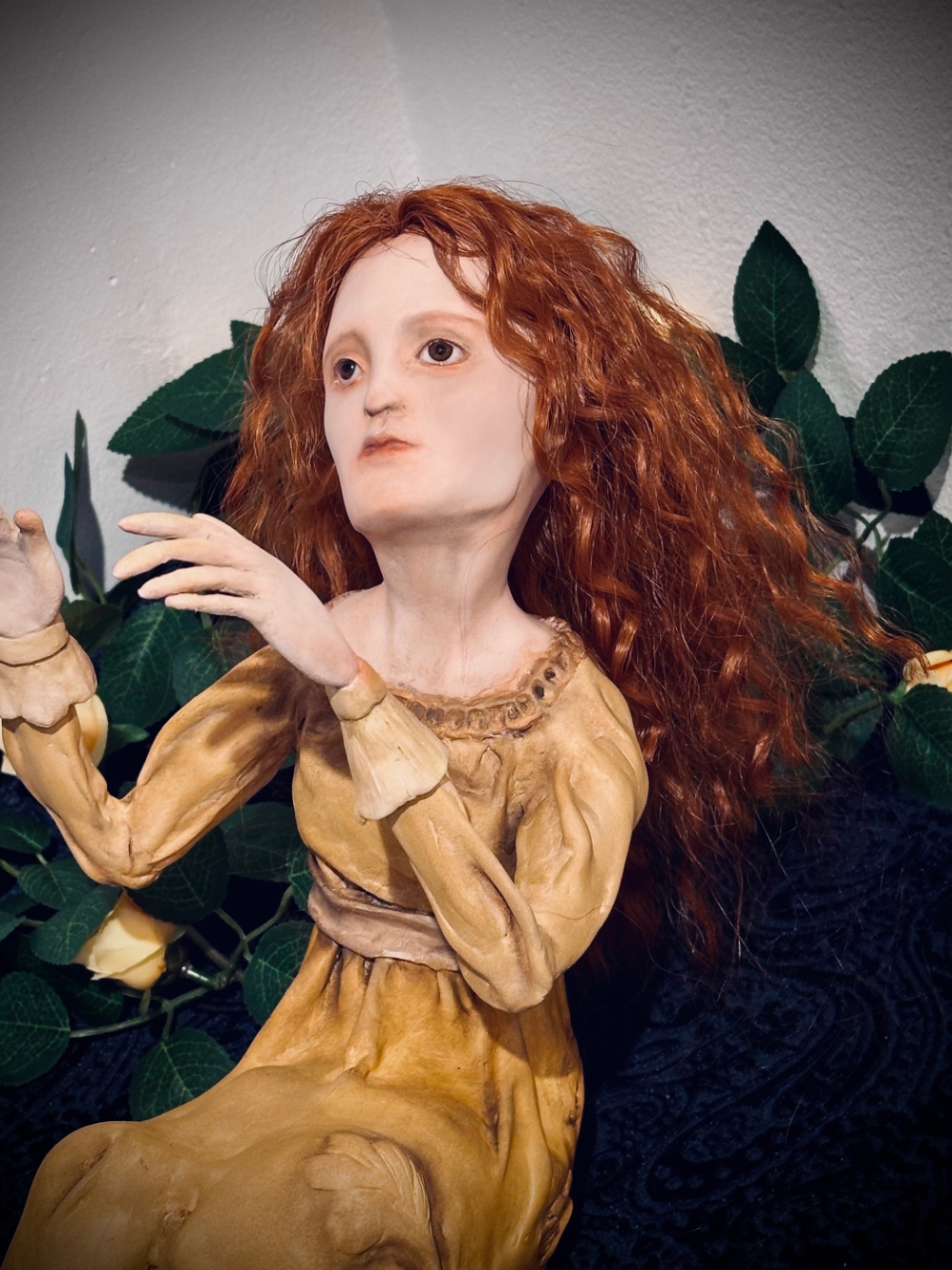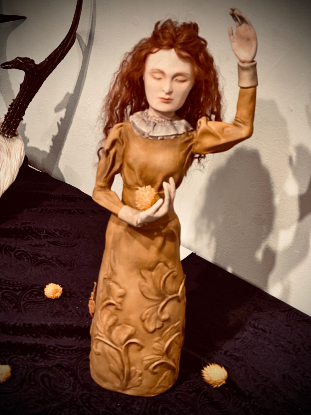 サルペトリエールにおける医者-患者間の関係、見られ診断され記録された客体としての患者について考えるとき、人形を作る主体としての自らと作られた人形という客体を意識せざるを得ません。19世紀末的表象で女性を造形すること、「患者」と「狂気」という他者が抱える苦しみに対してまなざすある種の嫌らしさと暴力性にライドする罪深さと、しかしそれを表象したい欲望の間で粘土をこねました。私が欲する幻想の形について、本作を制作しながら思案した次第です。