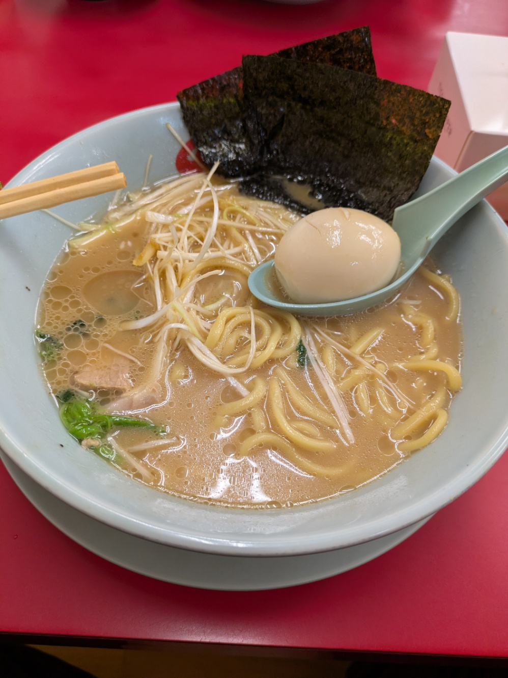夜にこんなごっついラーメンを食べるのは毎月のスポーツジム代への冒涜だけど、選択肢が限られているのだから仕方ない。という言い訳をしつつも顔は意気揚々と山岡家に入り、醤油ネギラーメンと、せっかくならと半ライスも注文した。