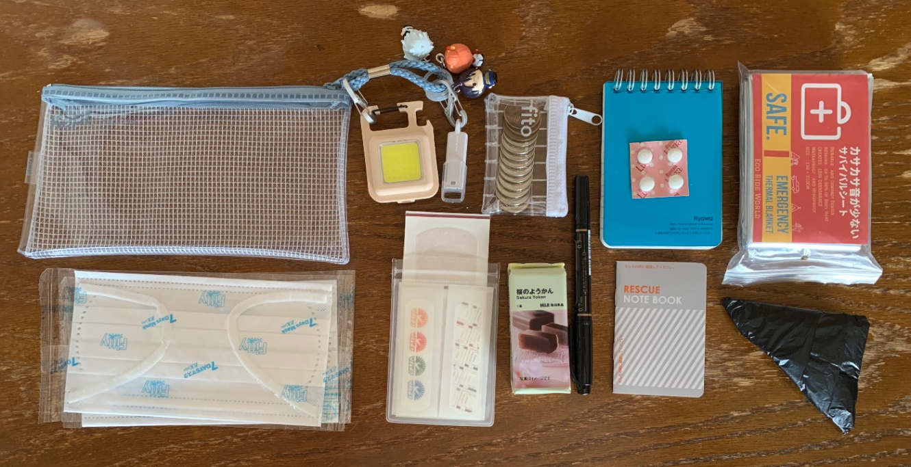 サバイバルシート/ゴミ袋(黒)/メモ帳/常備薬/レスキューノート(Can Do)/小銭/油性ペン/ようかん/キャップ付きホイッスル(Can Do)/充電式ライト(DAISO)/絆創膏(中サイズ/無印)+小サイズは追加したもの/マスク2枚