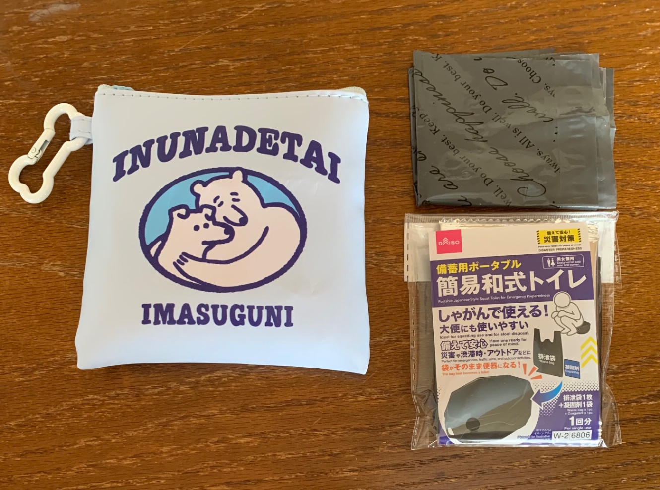 中身はナプキン1/2サイズ(24.5)を4つ、サニタリー袋(DAISO)2枚、簡易トイレ(DAISO)です。