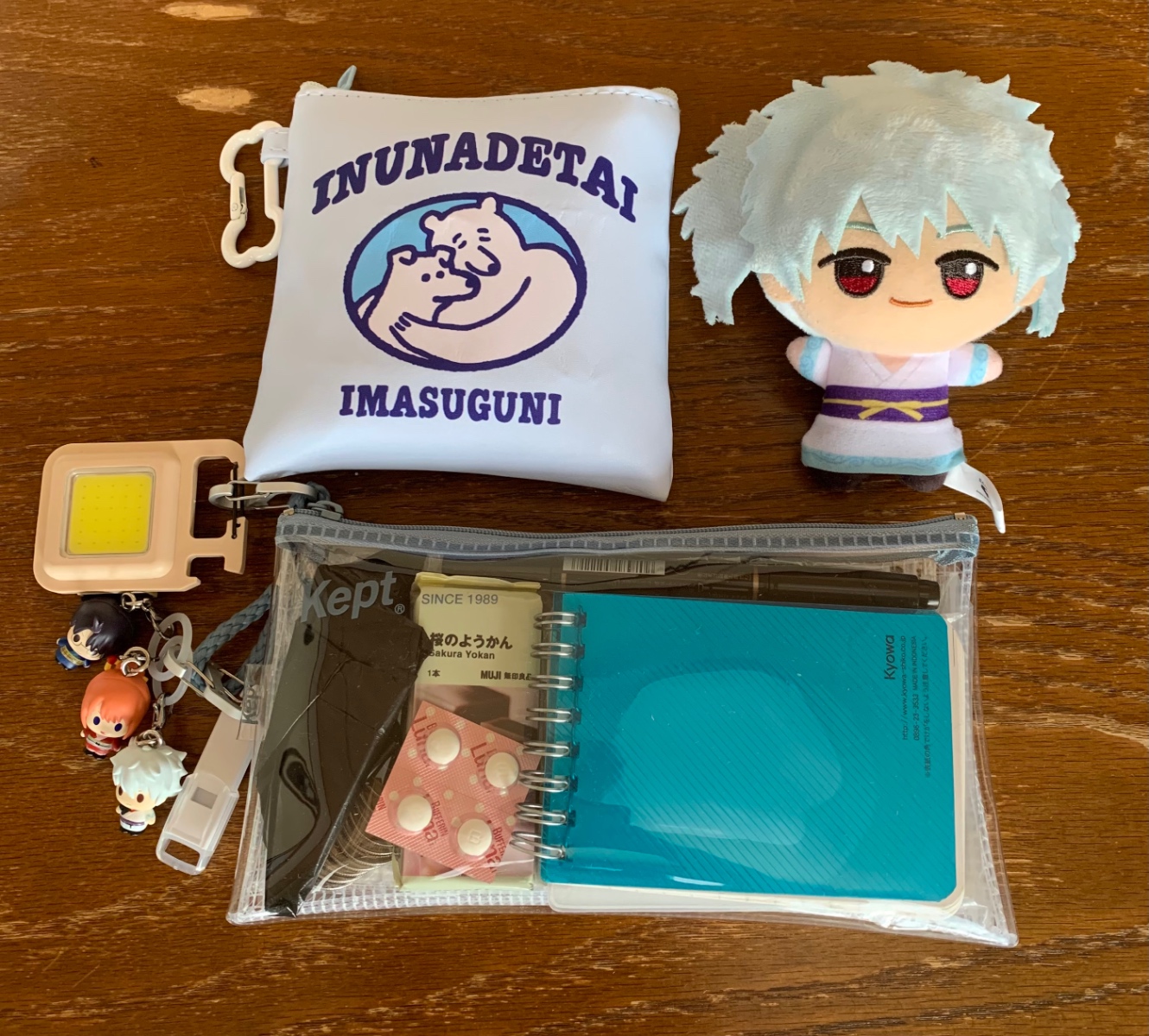 ポーチの他に500mlのクリアボトルにアイテムいれる場合もある。防災ボトルも作った事ありますが持ち歩きが続かなかった。部屋で寝てる…