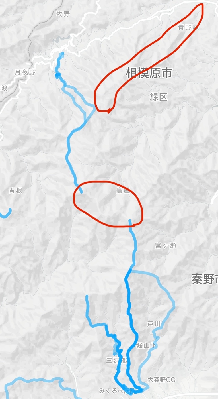 一緒に歩いた丹沢主脈も残りの未開拓箇所は北端の焼山〜黍殻山間と丹沢山〜蛭ヶ岳間になりました(赤丸の箇所)