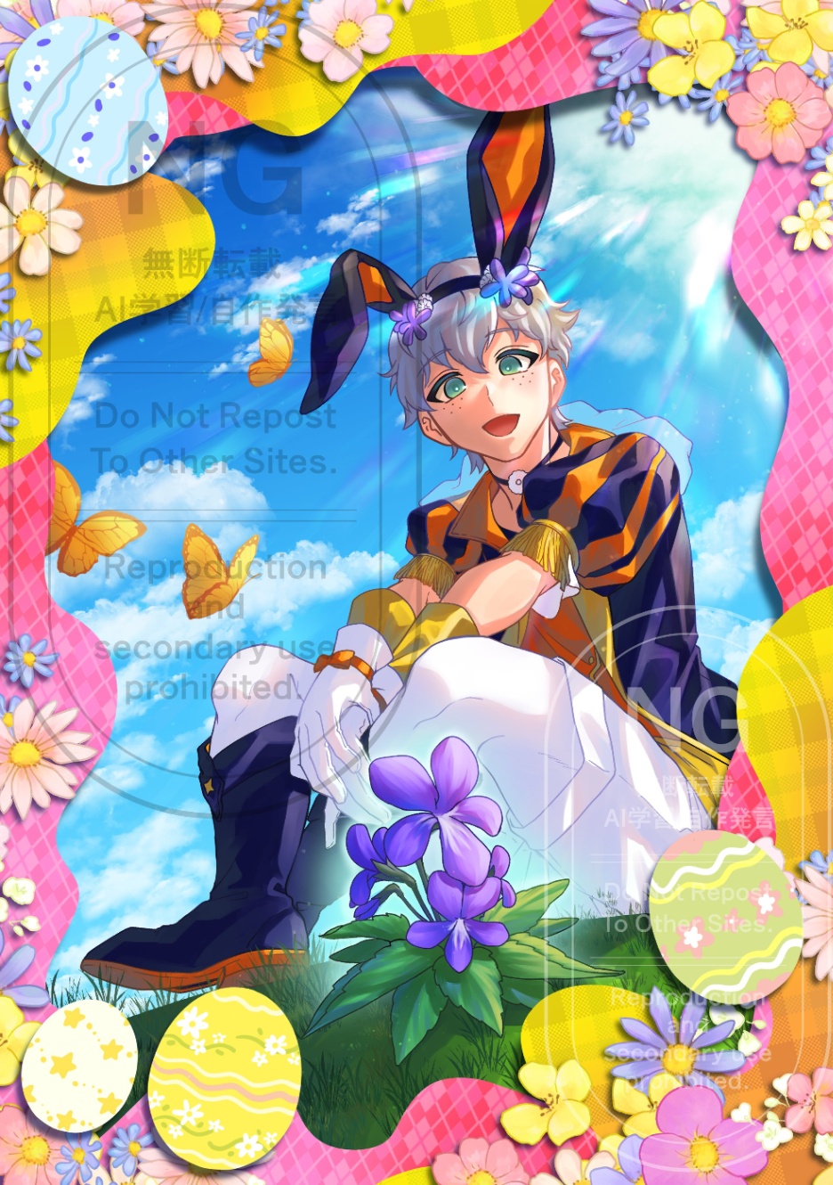 背景の大部分を占める青空に、春らしい色合いのピンクと黄色のフレームを描く事でお互いを引き立てる色合いにできたかなと思います。いつも晴れの時の色合いで塗ってるので、今後はこういう色の相性なども考えていきたいですね。