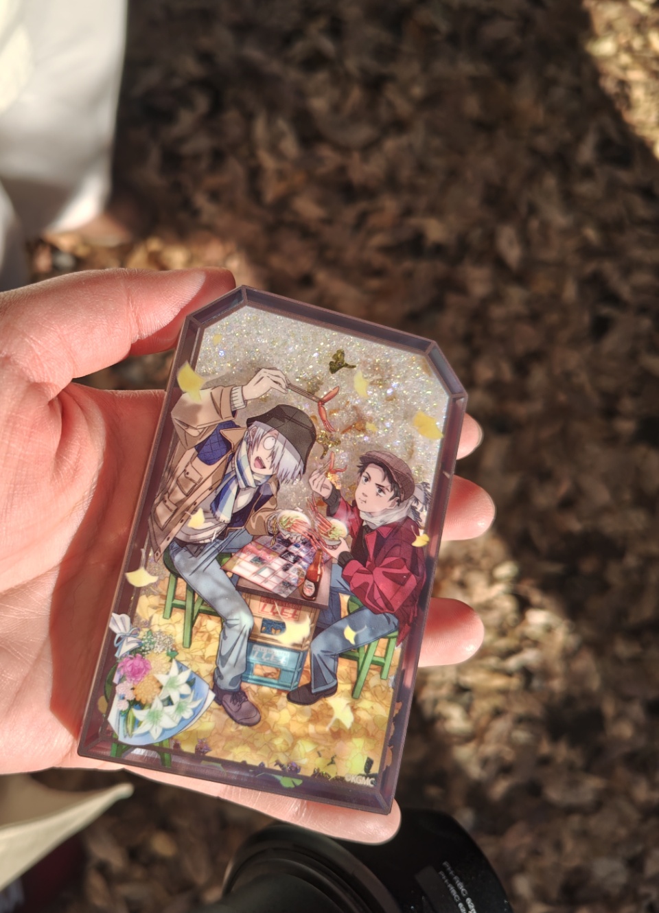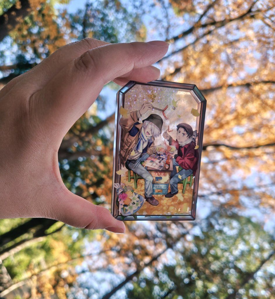 その後ポップアップショップで手に入れたアクリルブロック。これが…すごくいい!まず大きさがいい。大きすぎるとかさばるし、小さすぎると落としたりピント合わせに苦戦したりするけどそれがない。この中にスノードームみたいにキラキラの粉と銀杏の葉型のフレークが入ってて、それがまた秋の陽に透けてきれいです。欲を言えば倅たちのもほしかったな…ではありますが…。