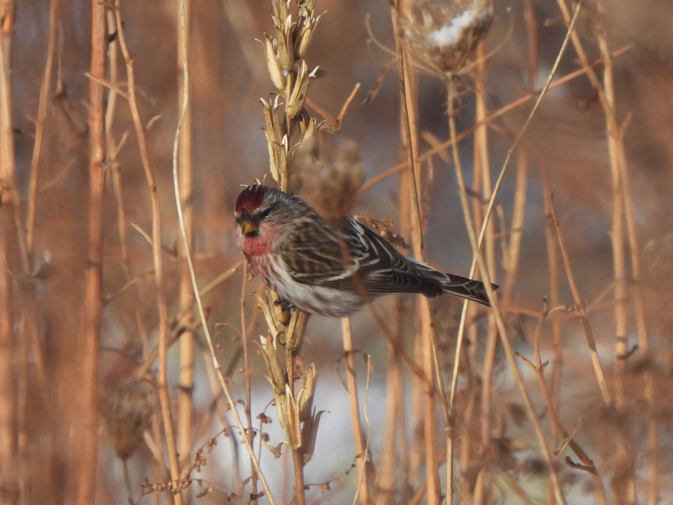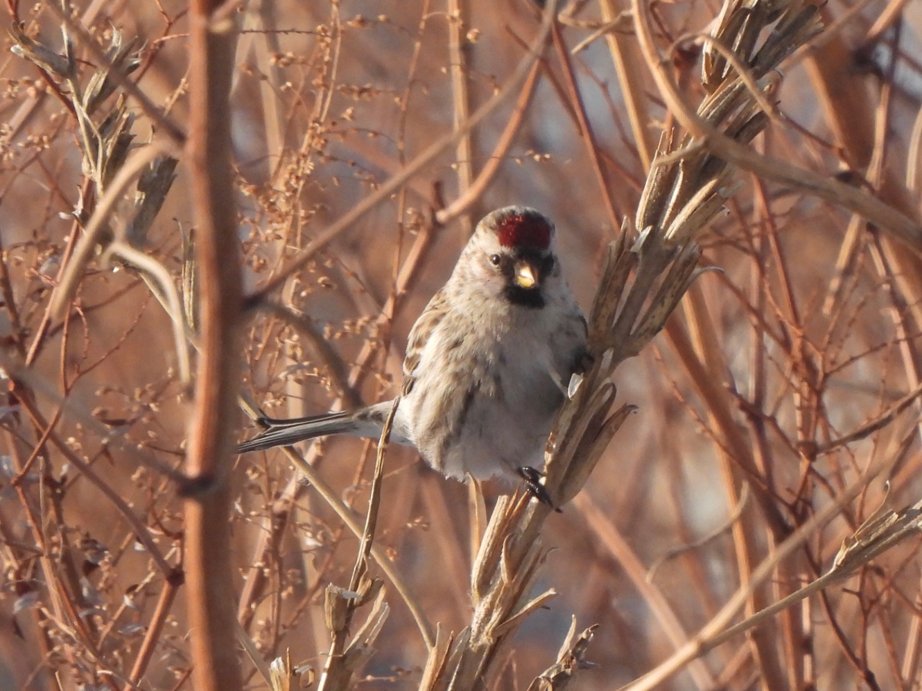 信じられん。ベニマシコは全体が赤いけど、ベニヒワは遠目で見ると白っぽくて頭頂部が真っ赤。オスは胸元も赤い。
