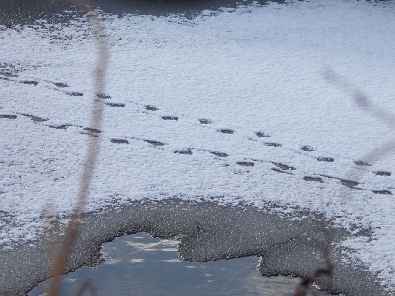 川の氷に積もる雪、その上を歩いた鴨の形跡。