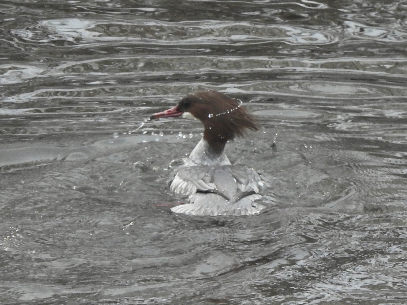 川の氷がいつもより溶けているのでカワアイサも川にいた。私の撮影技術がもっと高ければすんごい作品になりそうな一枚…