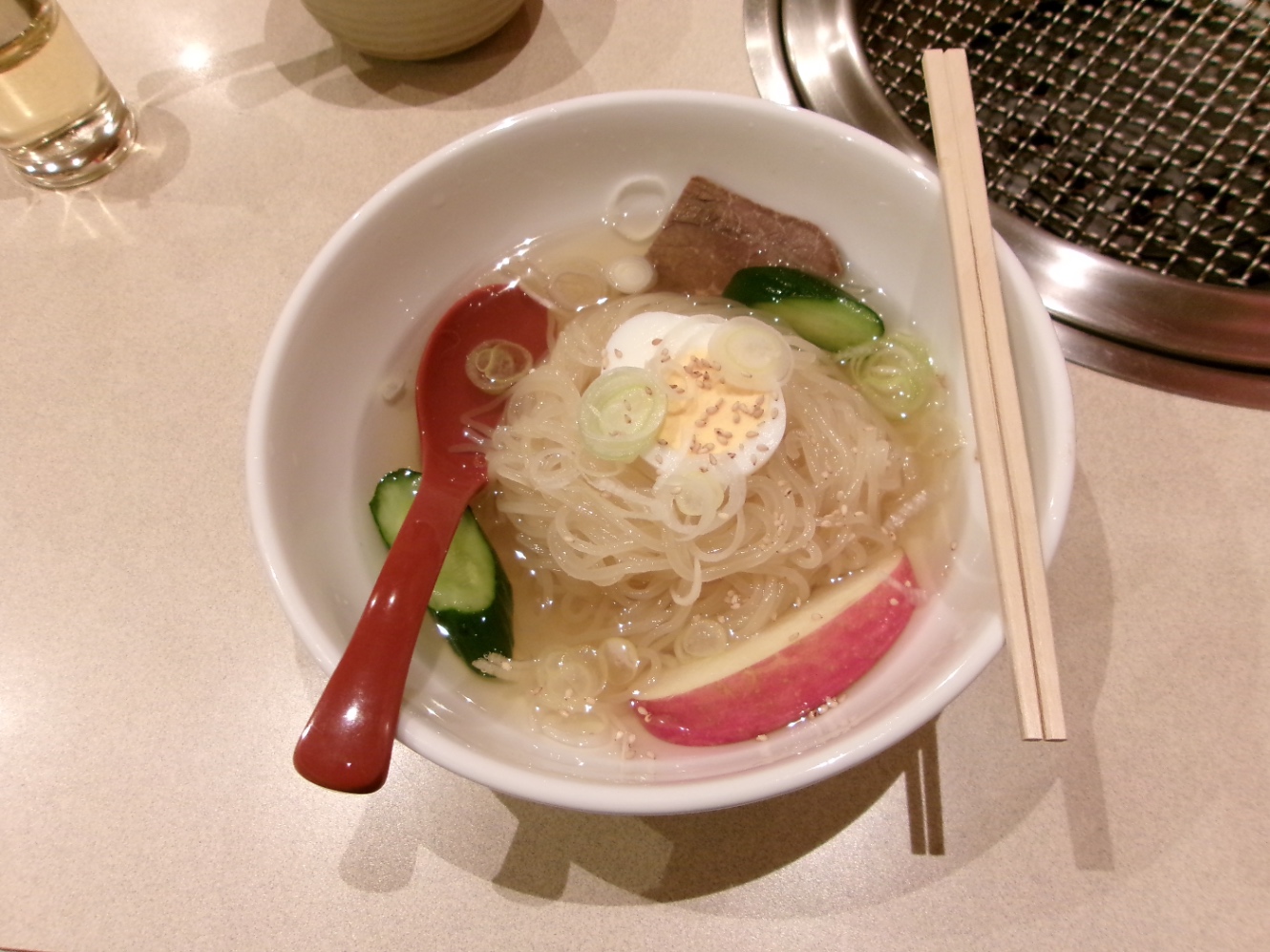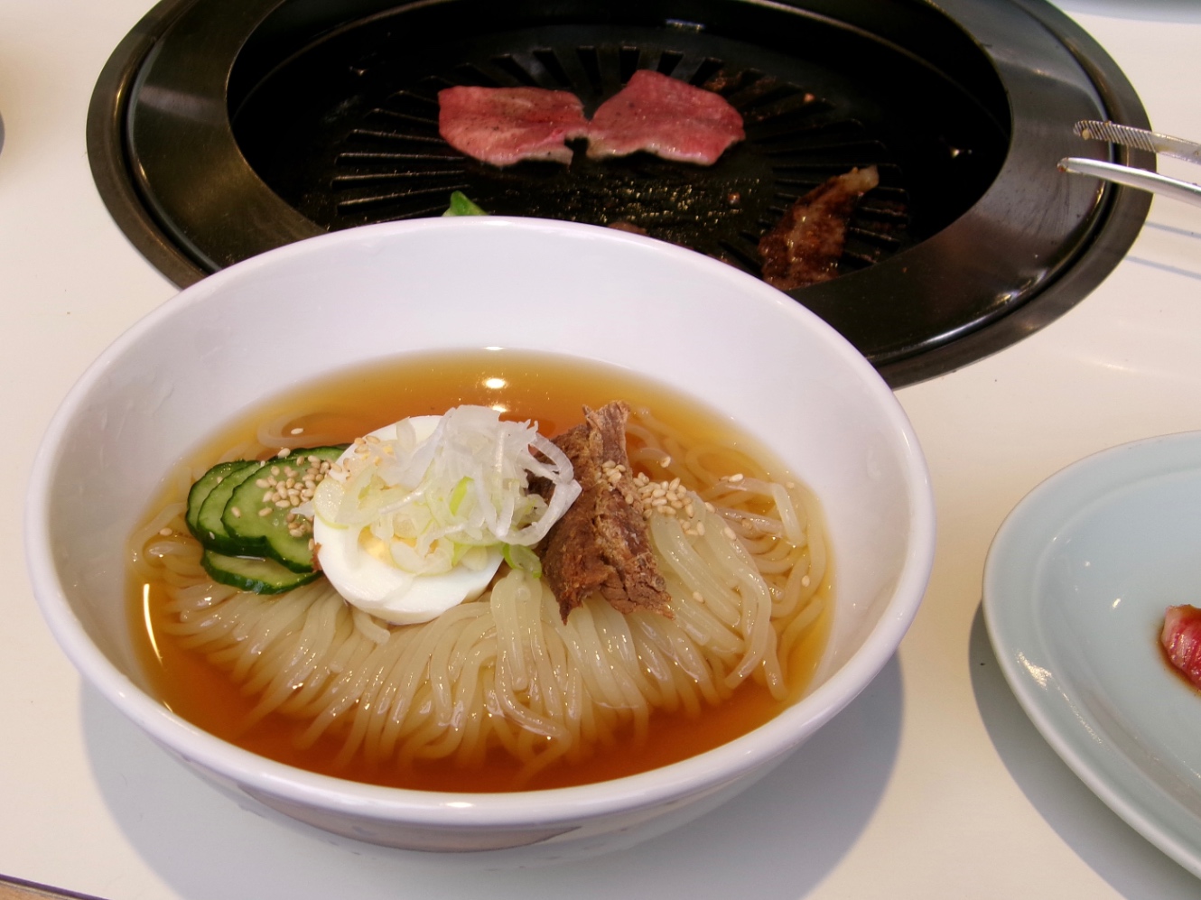 このお店の冷麺は、正確には平壌冷麺らしい。めちゃくちゃうまい。スープがほんのり甘くて出汁も効いている。麺は太めで最初は喉に詰まりそうになるくらい硬かったけど、3分くらいでちょうどいい硬さになった。店員さん曰く伸びやすい麺らしい。肉はビーフジャーキーみたいな乾燥した肉で噛めば噛むほどうまい。スープを全部飲んでしまう。