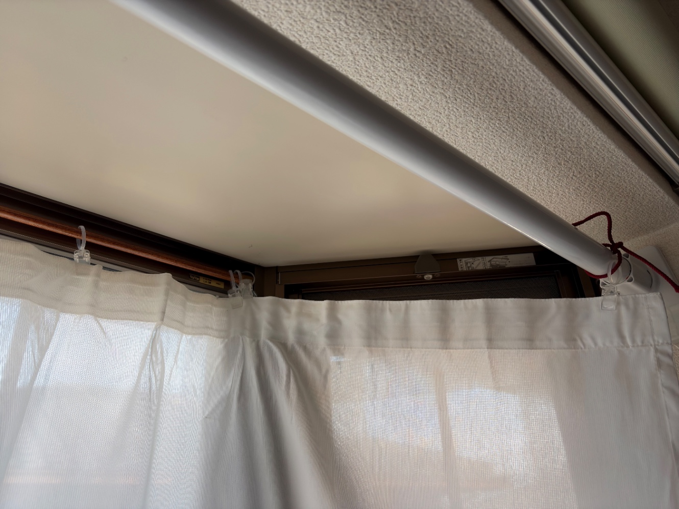 出窓のカーテンが白い突っ張り棒の位置にあったんだけど、もう一本突っ張り棒出してきて出窓に沿う形にした。