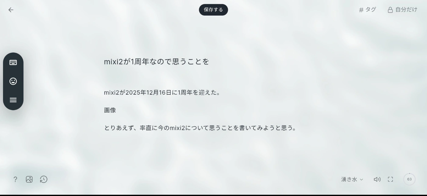 湧き水というやつを設定したら、ずっと水がちょろちょろ流れてて面白かったから、いろいろなムードを設定しながら文章を書いてみるのも楽しいかもね?
