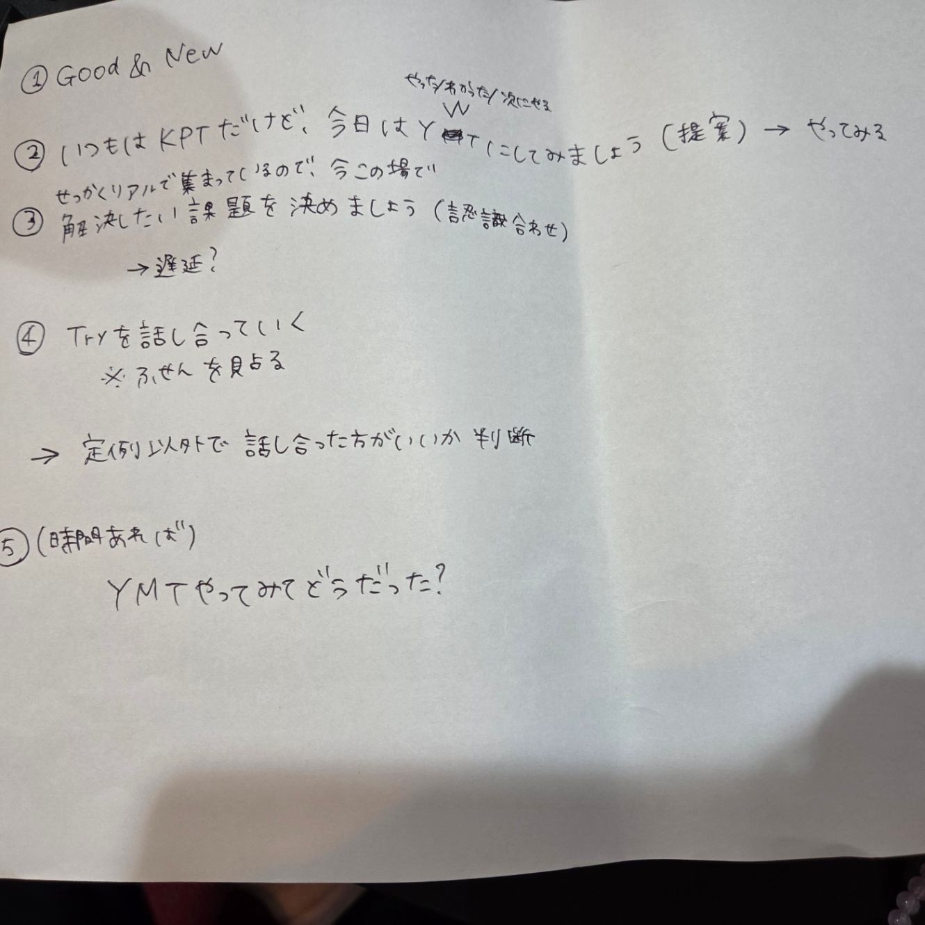 私はこんな感じで考えてみました。ギスギスしている状態でKPTをやるとPばかりが出てくるのではないかと思ったので、YWTに変えることを提案してやってみるシナリオです。