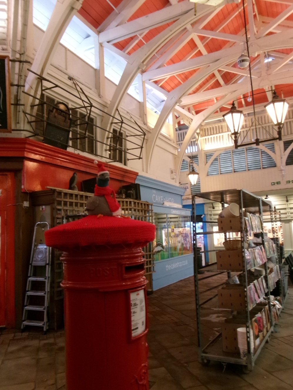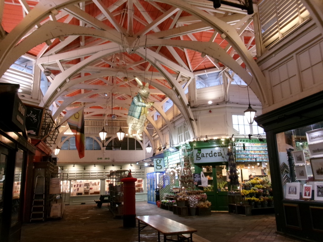 The Covered Marketと呼ばれる屋内市場も見学。平日かつ朝早いのでお店はあまりやってなかったけど、不思議の国のアリスモチーフの装飾がかわいい。イギリスも雨が多いから、市場も屋内になるのかな