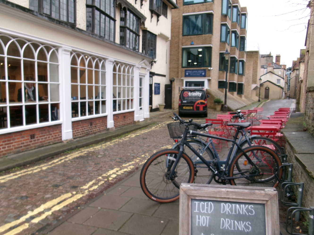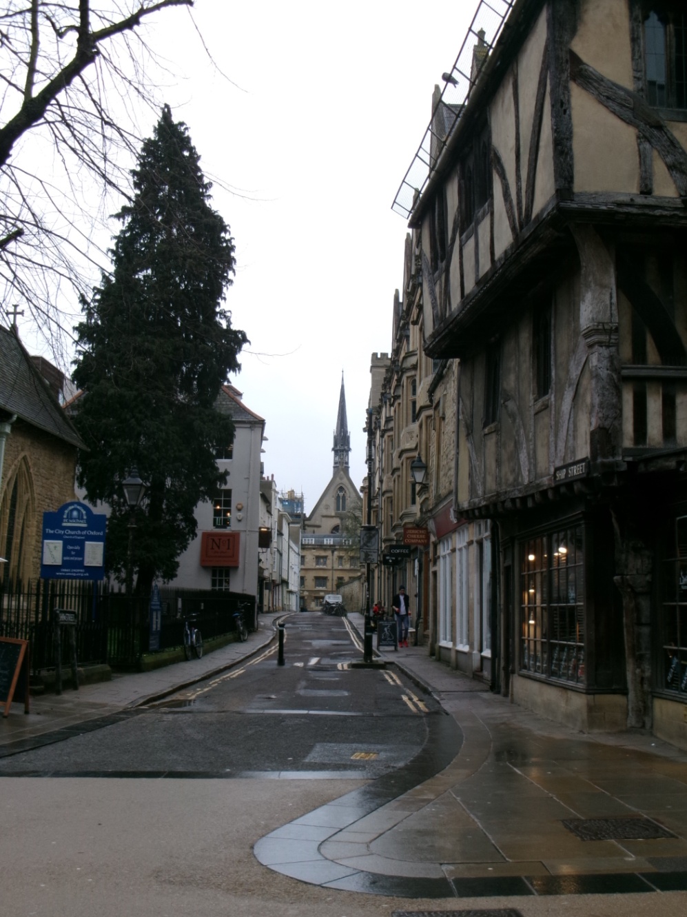 この角の建物はオックスフォードでも特に古い建物とのこと。調べたらもともと15世紀のものらしい。2階以上の部分が結構斜めっているように見えて、ちょっとこわい。でも美女と野獣エリアにありそうな建物でかわいい