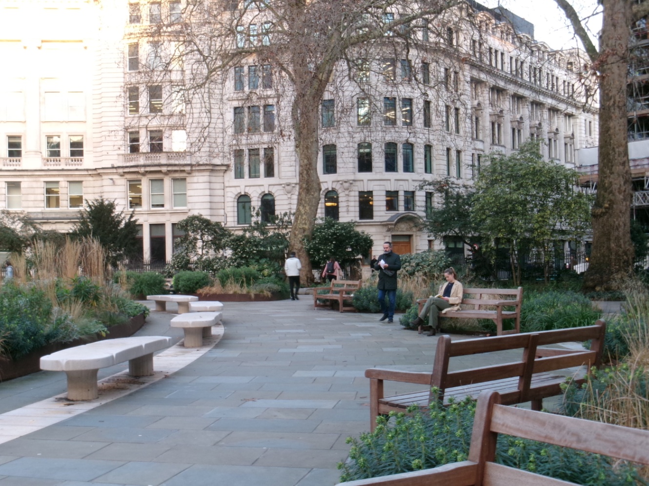 ロンドンの町中には公園を取り囲むようにアパートメントが並ぶ丸い広場が多く、散歩にも休憩にもよい。ベンチがたくさんあるってすばらしい。現地民は犬の散歩をしたり本を読んだり、談笑したりしている。東京ではお金を払ってカフェに入るか、縁石に座るしかないので羨ましい……